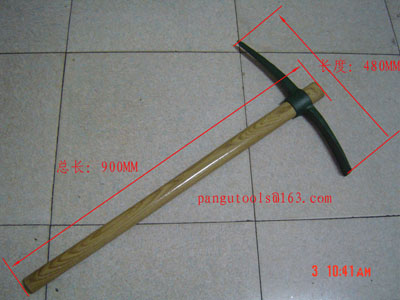 木質把兒,鐵質的頭部,整個呈T型,形似鶴嘴鋤,一頭尖,另一頭呈扁平鏟狀。